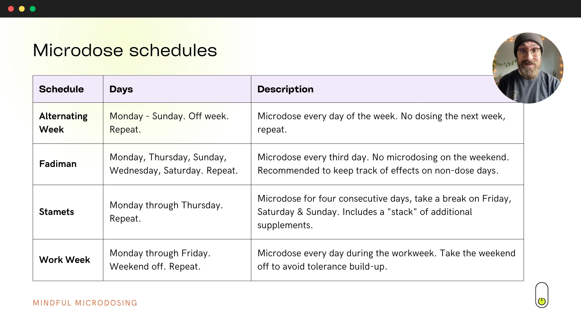 You’ll learn to design your ideal microdose protocol—finding your sweet spot dose (tailored to the psychedelic you’re using), timing, frequency, and duration.